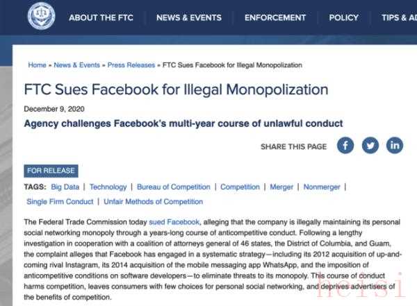 △美國(guó)聯(lián)邦貿(mào)易委員會(huì)官網(wǎng)發(fā)布關(guān)于起訴臉書(shū)的相關(guān)消息