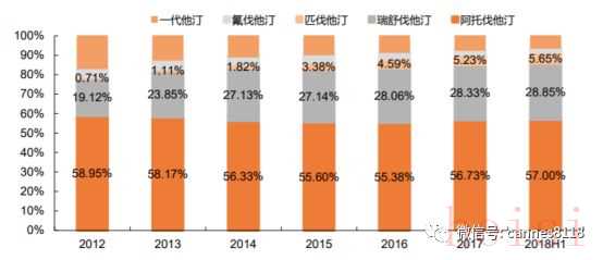 下圖:樣本醫(yī)院7個他汀類藥品占他汀類整體的比例