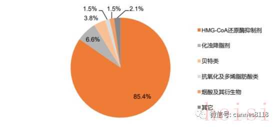 由于他汀類藥物能夠針對性地減少膽固醇的生成,多項大規(guī)模臨床試驗結(jié)果一致顯示他汀類藥物在 ASCVD 一級和二級預防中均能顯著降低心血管事件危險,因此,他汀類已成為防止這類疾病最為重要的藥物。據(jù)統(tǒng)計,他汀類產(chǎn)品,即 HMG-CoA 還原酶以 157 億元 占據(jù) 2016 年國內(nèi)降血脂市場 85.4%的份額,遠遠領先其他品類。排名第二位的化濁降脂劑占比僅 6.6%。