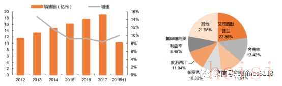 下圖:樣本醫(yī)院抗抑郁藥銷售額及增速 下圖 2018H1 樣本醫(yī)院抗抑郁藥競爭格局