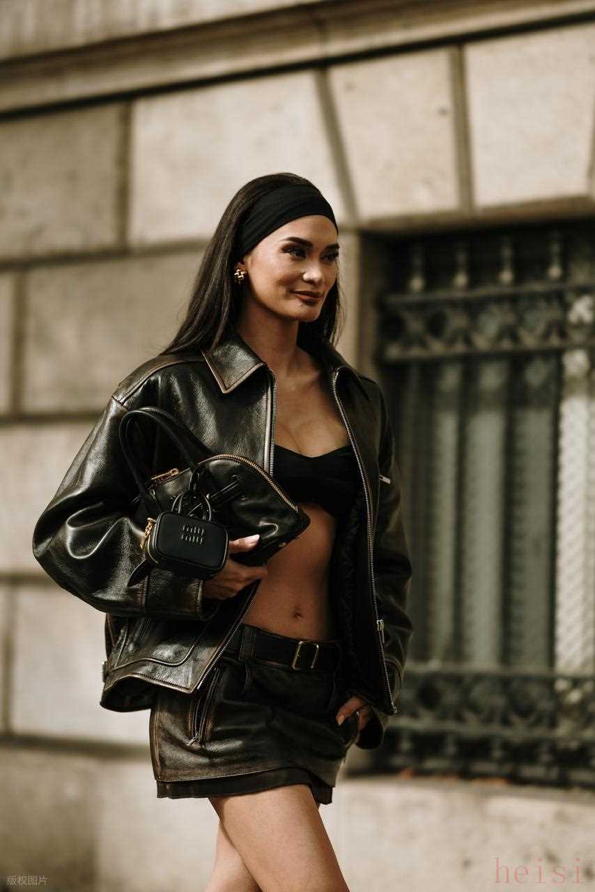 內(nèi)搭的選擇讓造型更有層次感 ——黑色透明紗質(zhì)上衣自帶朦朧美,透視設(shè)計(jì)巧妙展現(xiàn)身材曲線,卻不顯得浮夸;領(lǐng)口的蝴蝶結(jié)裝飾更是點(diǎn)睛之筆,中和了皮衣的酷感,增添了一絲甜美氣息,讓整體造型 “剛?cè)岵?jì)”,打破了皮衣只能走 “酷颯風(fēng)” 的刻板印象。