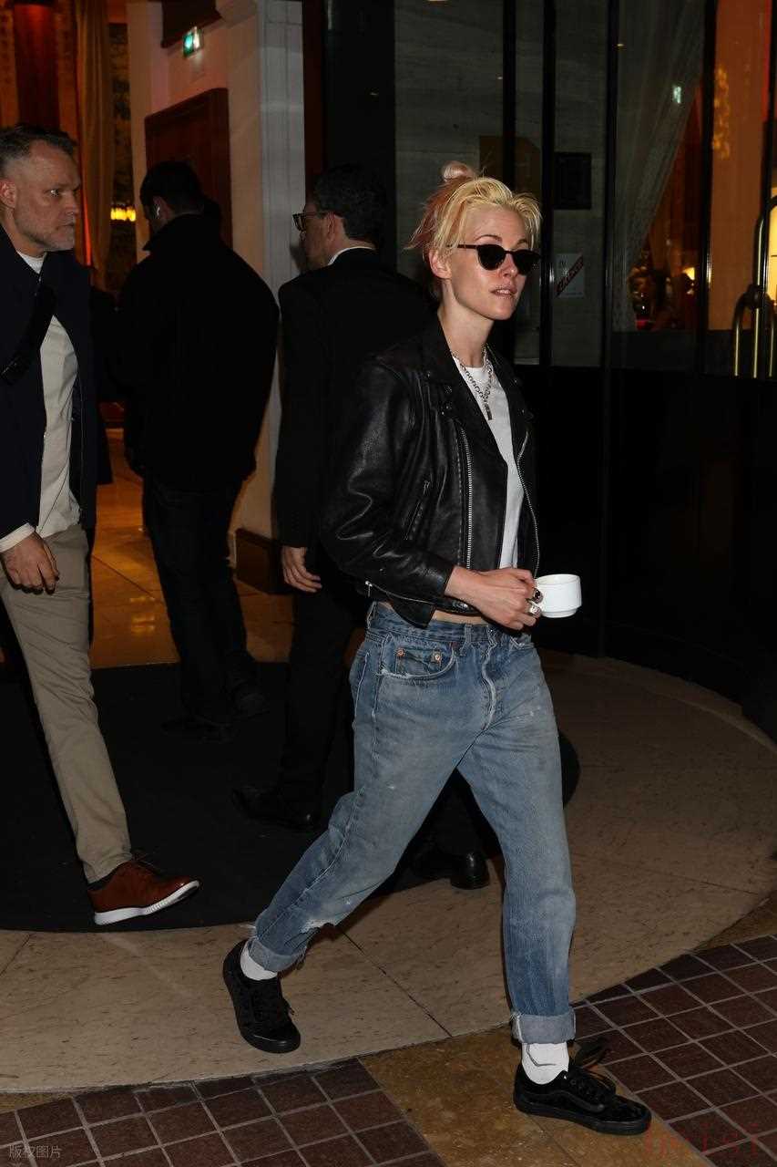 3. 克里斯汀-斯圖爾特:黑色皮衣 + 白色 T 恤 + 牛仔褲,經(jīng)典百搭不踩雷