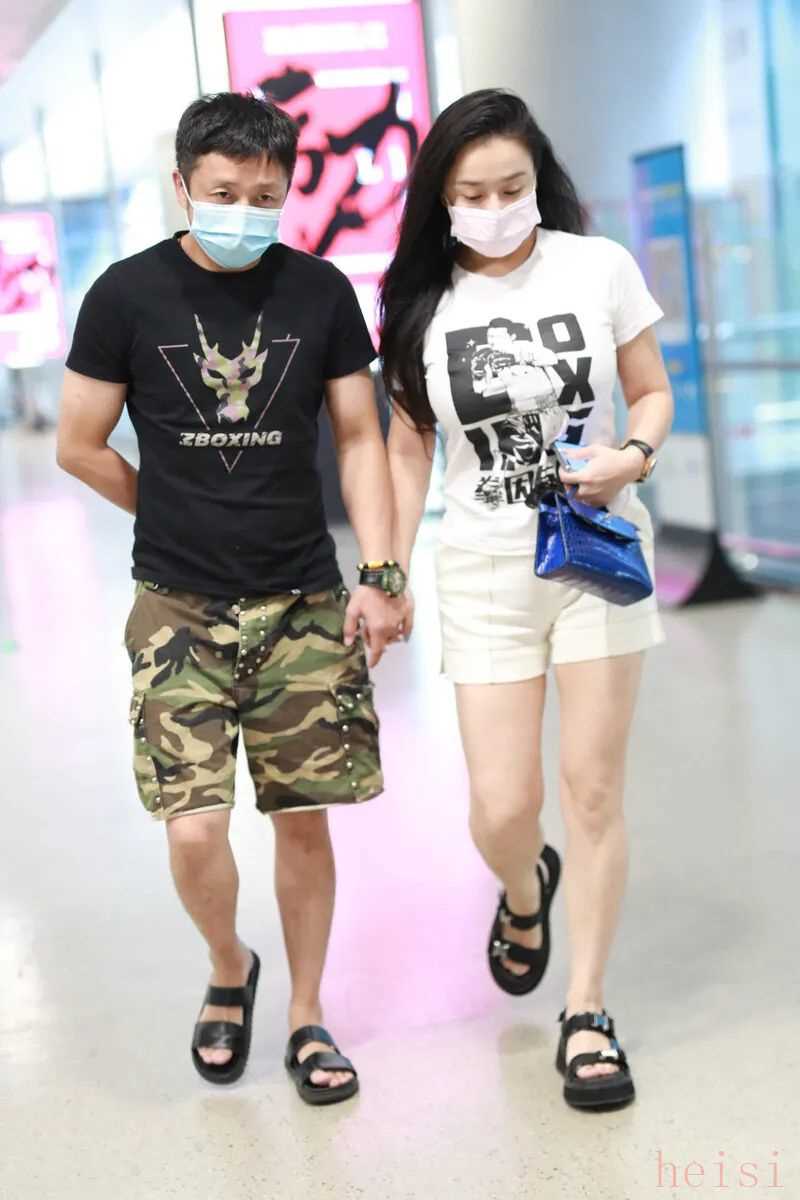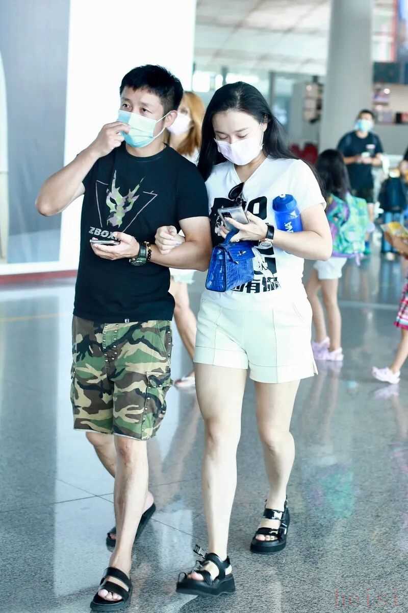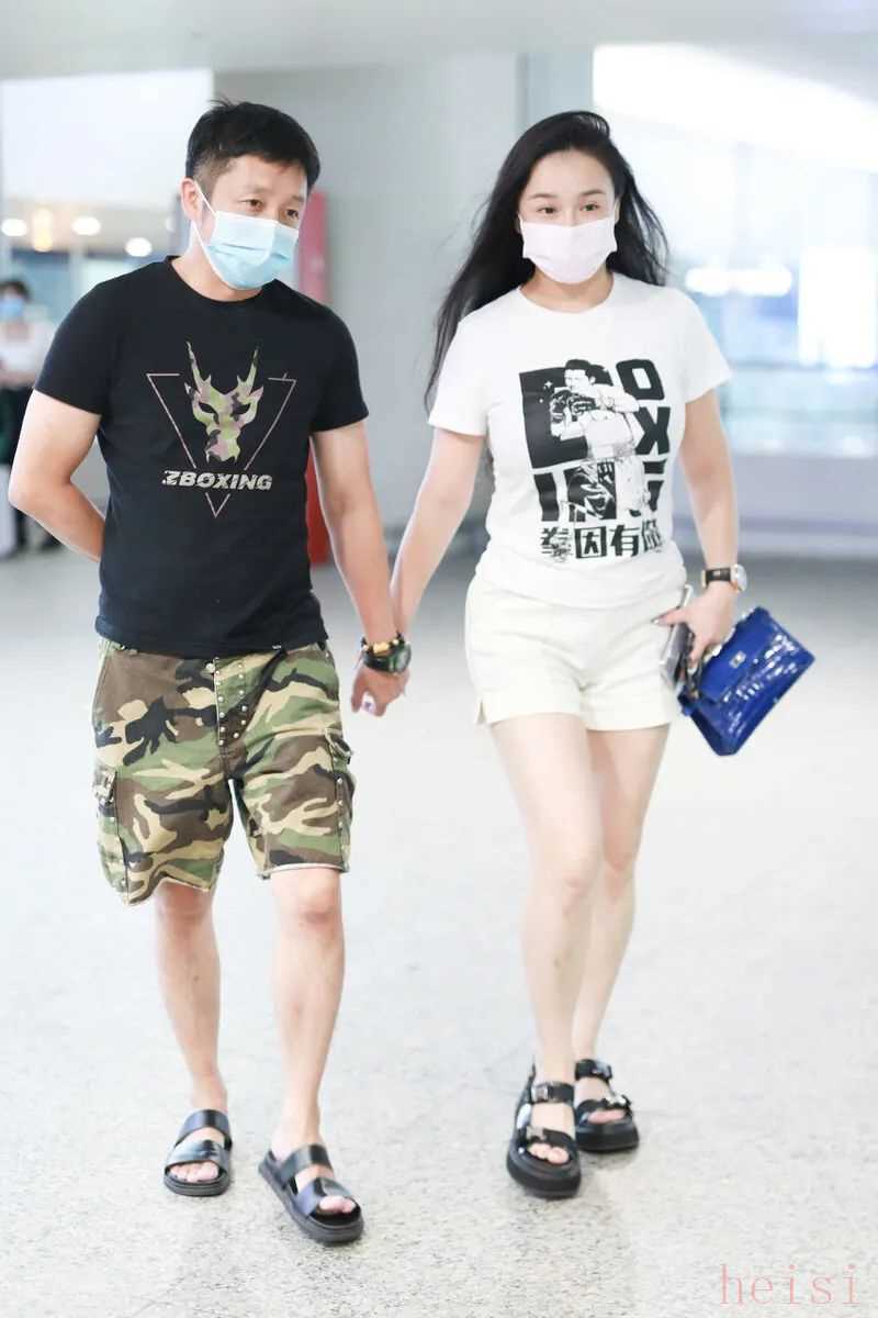 而妻子的造型就顯得更加簡潔大氣,白色的圖案T恤搭配一條白色的短褲,造型在色調(diào)就很簡潔,和鄒市明的造型在色調(diào)上形成很大的對比,兩人都搭配一雙黑色涼鞋,造型顯得休閑隨和。