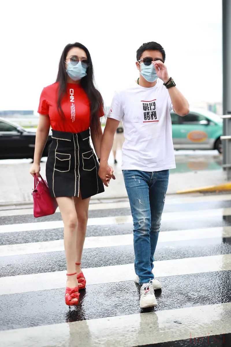 合身版型牛仔褲搭配白T的造型非常經(jīng)典,整體的色調(diào)也是很清爽,旁邊妻子的造型則是紅黑的撞色搭配,高腰的短裙能讓身材變得更加出眾。