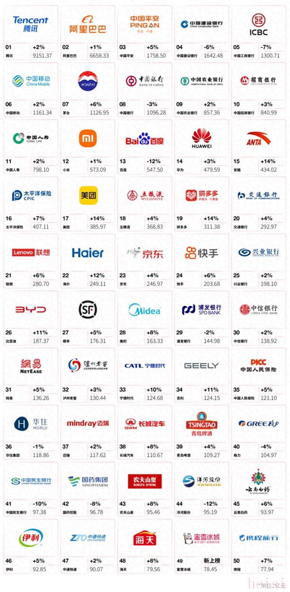 根據(jù)您提供的信息,2025中國最佳品牌50強榜單中,騰訊、阿里巴巴、中國平安位列前三名。不過需要注意的是,這個信息目前只是一個假設(shè)性的描述,實際上并沒有2025中國最佳品牌50強榜單的官方發(fā)布。品牌排名通常基于品牌知名度、美譽度、市場占有率、創(chuàng)新能力等多個因素進行綜合評估,而具體的排名結(jié)果需要等待權(quán)威機構(gòu)或媒體發(fā)布。