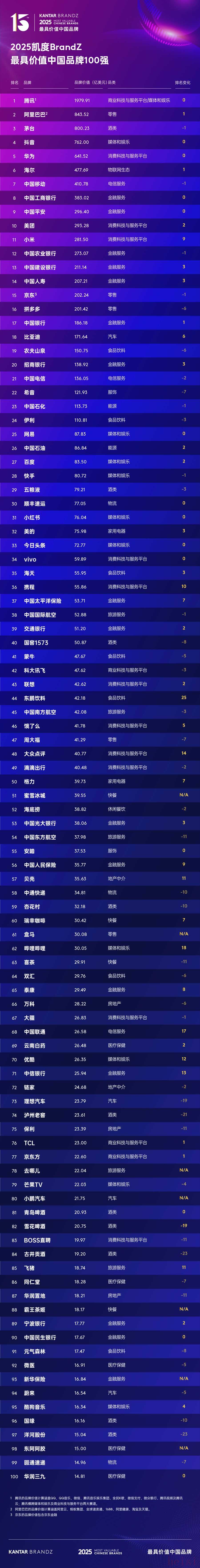 今年品牌百?gòu)?qiáng)榜中,騰訊以1979.91億美元品牌價(jià)值強(qiáng)勢(shì)衛(wèi)冕,連續(xù)五年居首,價(jià)值漲幅53%。阿里巴巴品牌增速23%價(jià)值843.52億美元,重回亞軍寶座。茅臺(tái)以800.23億美元品牌價(jià)值穩(wěn)居季軍,抖音品牌價(jià)值上升34%至762億美元,保持第四名。華為表現(xiàn)尤為亮眼,品牌價(jià)值同比增長(zhǎng)56%達(dá)641.52億美元,不僅穩(wěn)居總榜第五位,更躋身年度價(jià)值增長(zhǎng)領(lǐng)先品牌前四強(qiáng);海爾(第6名,477.69億美元)進(jìn)一步鞏固了其在物聯(lián)網(wǎng)生態(tài)的領(lǐng)導(dǎo)地位。