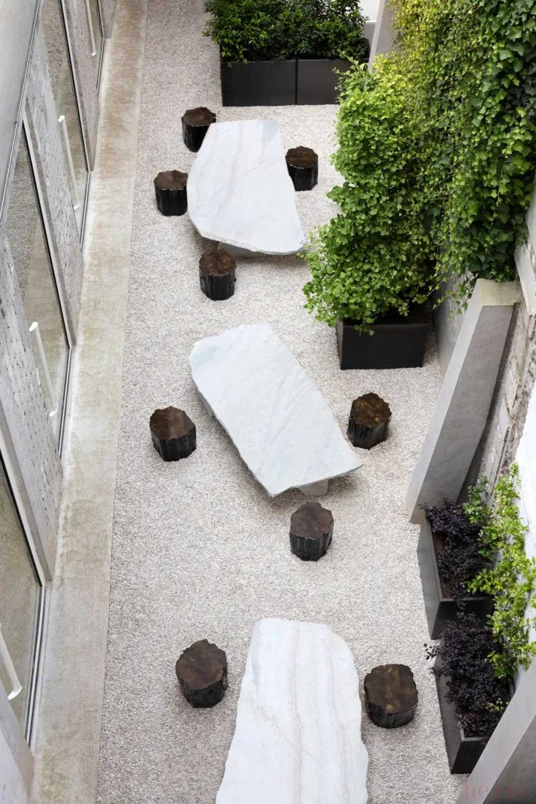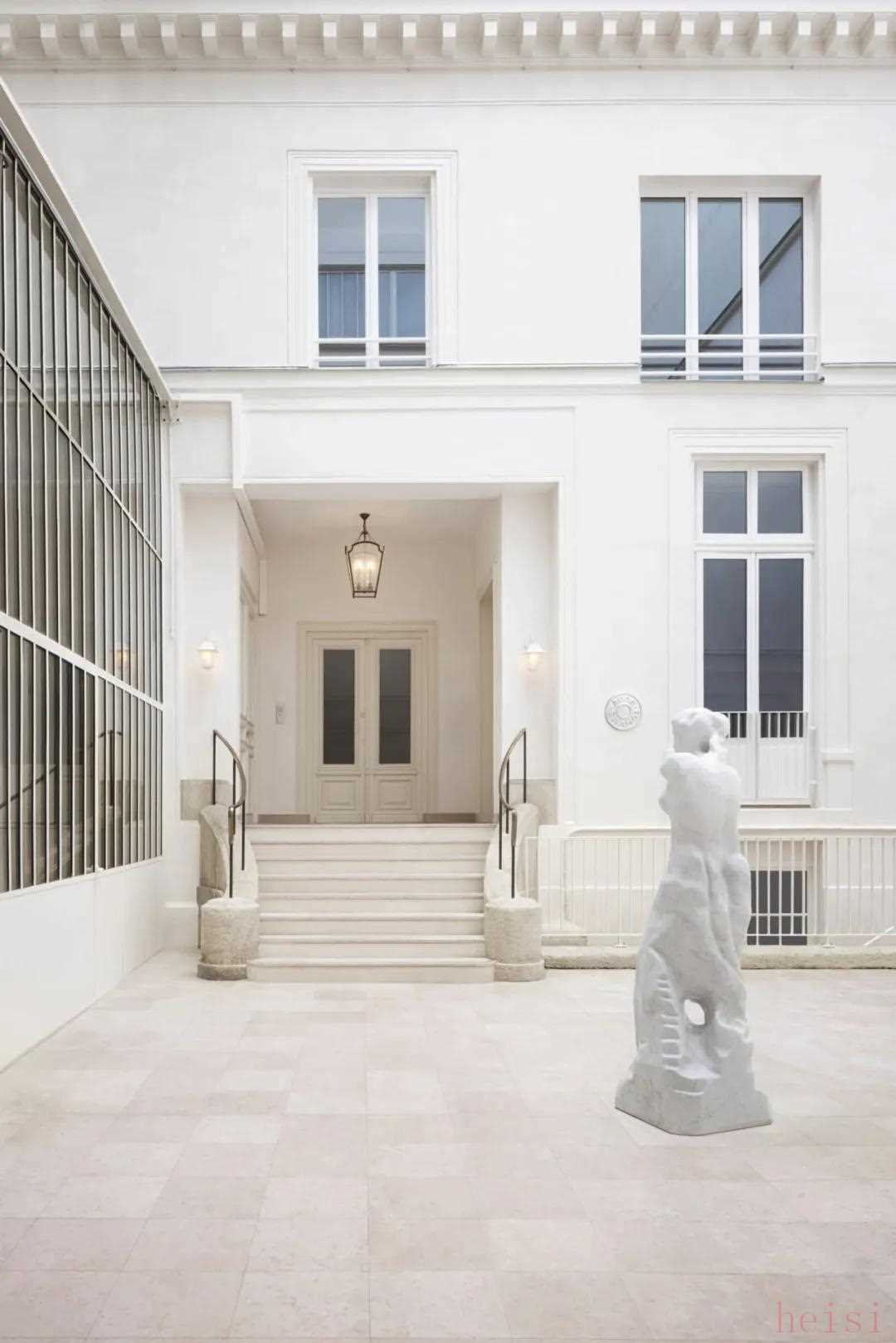 △2011 年拍攝的 rue des Petites-écuries 街景可看到 Acne 總部所在街區(qū)的典型 19–20 世紀混合立面新總部以中央庭院作為核心布局,入口位于原 Prevet 家族的私人府邸。其設(shè)計理念為“最小干預(yù)”的方式讓舊建筑煥發(fā)新生。庭院保留了極簡的幾何構(gòu)造,中央陳列藝術(shù)家 Daniel Silver 創(chuàng)作的大理石雕塑,帶來古典與靜謐的氛圍。