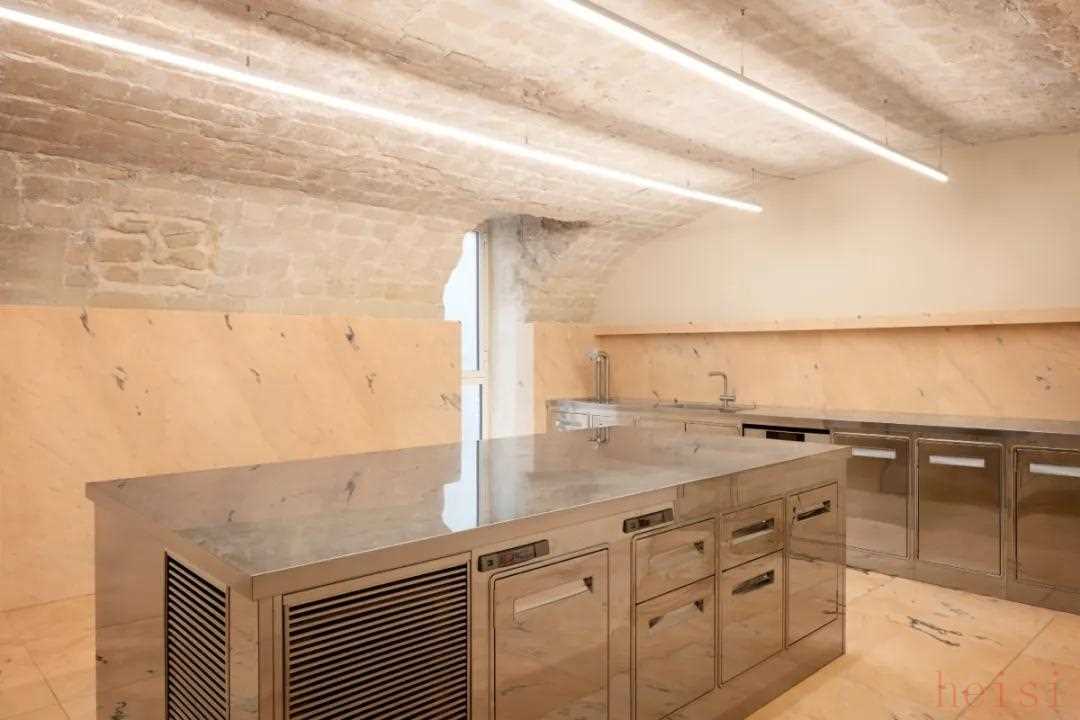 廚房空間保留了原實驗室的瓷磚地面和磚砌拱形天花板,這種帶有年代感的材質(zhì)成為視覺基底,呼應(yīng)了建筑的科學(xué)與工業(yè)背景。