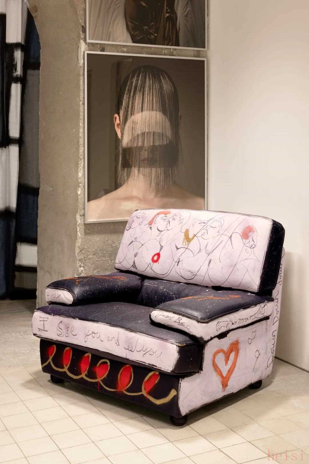 空間中央放置兩張由 Max Lamb 設(shè)計的粉色高光乙烯基沙發(fā),既前衛(wèi)又帶著標(biāo)志性的“丑酷”美感。