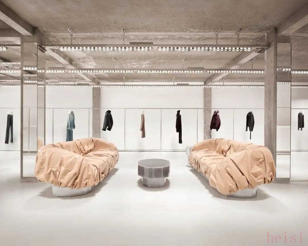 貴賓試衣間采用雙層挑高的窗簾營造私密氛圍,搭配 Lukas Gschwandtner 設(shè)計的座椅,呼應(yīng)他為 Acne Studios 2024 春夏秀場打造的“身體曲線”靈感。