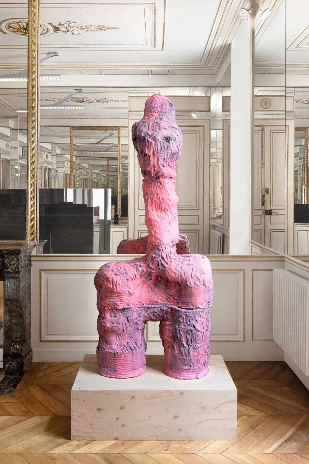 擺放在角落的粉紅雕塑同樣出自 Daniel Silver 之手,其表面處理異于與庭院石像,更顯 Acne Studios 粗獷美學(xué)。