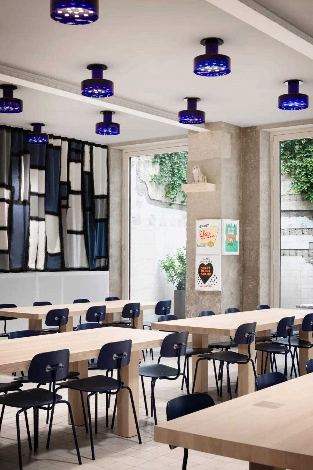 員工餐廳保留原始瓷磚地面,配以淺色木質(zhì)長桌與不銹鋼廚房臺面,向?qū)嶒炇視r代的工業(yè)氛圍致敬。