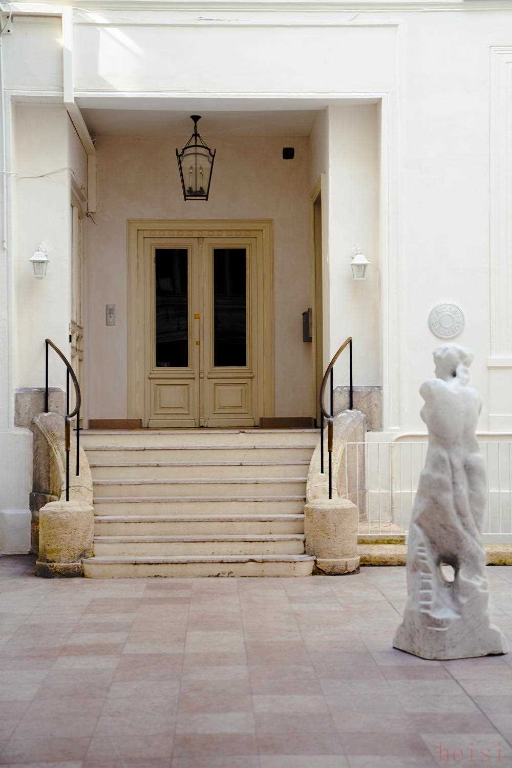 整個新總部圍繞著建筑本身的庭院設(shè)立起來,入口位于普雷維家族的舊府邸,他們在20世紀初因生產(chǎn)草本酊劑和精油而聲名鵲起。庭院經(jīng)過簡化處理,中央安置著藝術(shù)家Daniel Silver的大理石雕塑,呼應(yīng)古典造型。穿過庭院,迎面而來的是接待與等候空間,墻面上的金色線條裝飾、木質(zhì)鑲板與人字拼木地板均經(jīng)精心修復(fù)。原始細節(jié)與當代家具相互對話:Lukas Gschwandtner的設(shè)計家具、Silver的雕塑,以及美甲藝術(shù)家Sylvie Macmillan創(chuàng)作的燭臺。