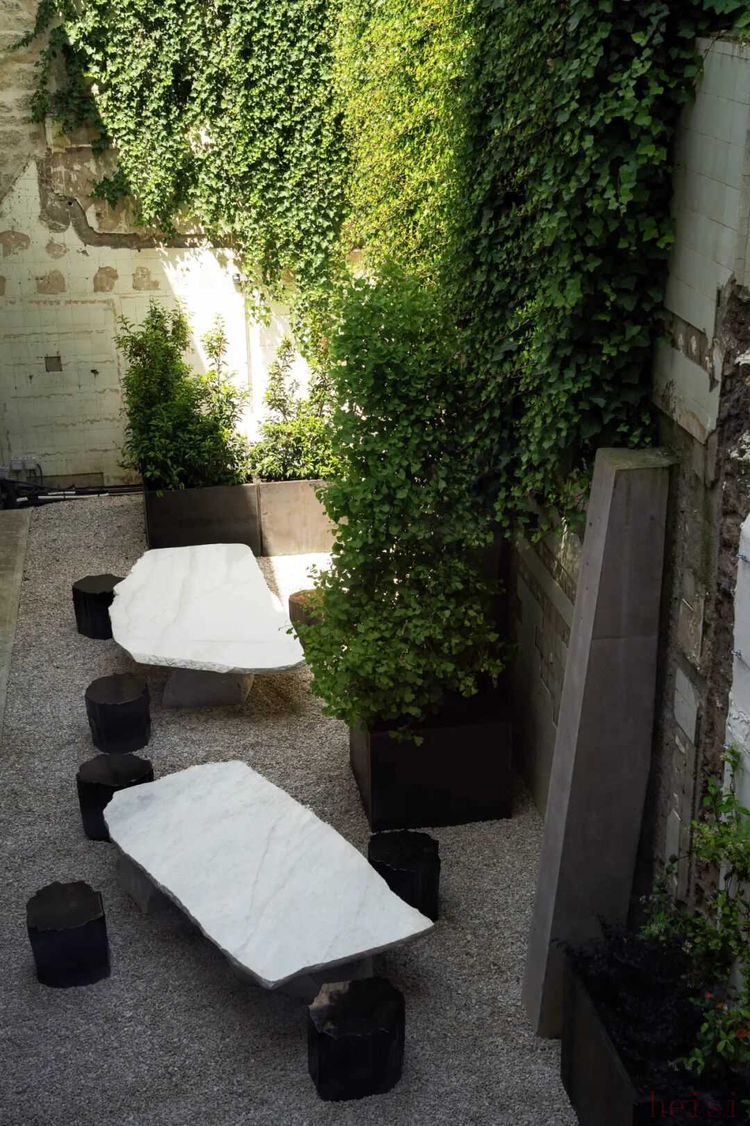 在另一處空間,VIP試衣間通過雙層高的厚簾確保私密性,Gschwandtner的座椅呼應(yīng)他為 Acne Studios 2024春夏女裝秀設(shè)計的布景—靈感源自人體舒展的線條。充滿自然光的餐廳則鋪設(shè)著原有的瓷磚地面,搭配淺色木質(zhì)長桌與不銹鋼廚房,令人聯(lián)想到科學(xué)實驗室的工業(yè)工作臺面—這是對建筑原始功能的呼應(yīng)。餐廳通向一處下沉式室外花園,園中設(shè)有 Max Lamb設(shè)計的公共座椅。