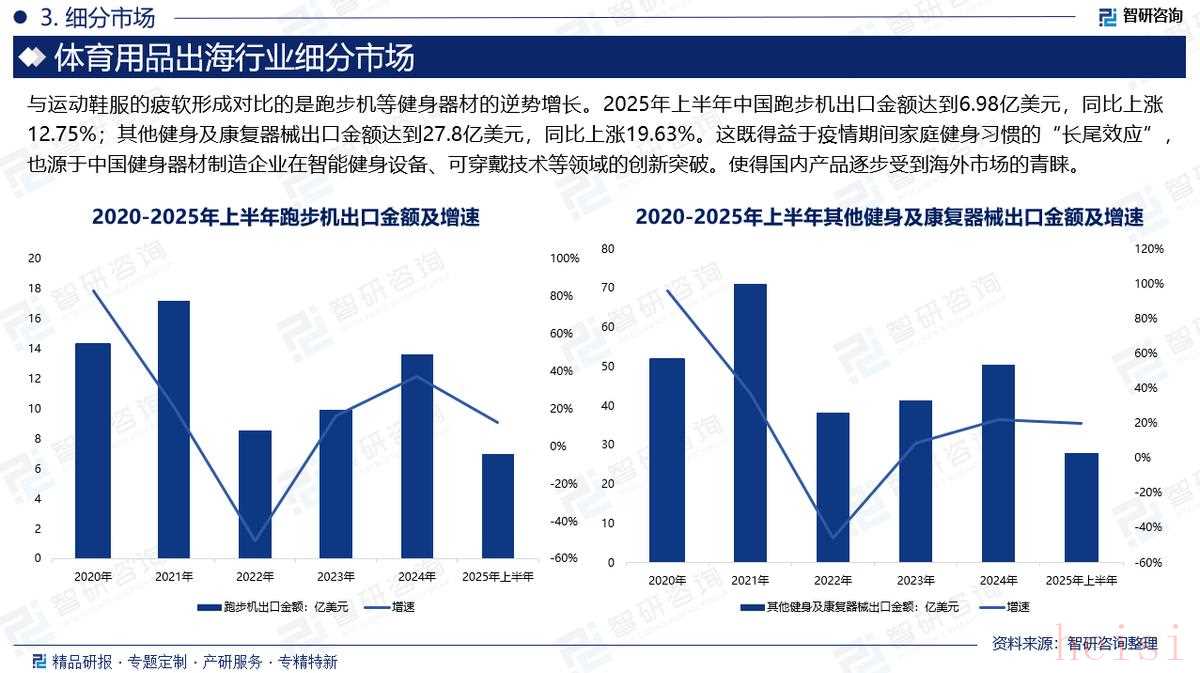 出口金額:根據(jù)中國海關(guān)數(shù)據(jù),近幾年,體育用品對(duì)外貿(mào)易出現(xiàn)大幅度震蕩,經(jīng)過 2023年的去庫存周期,國際體育用品市場需求逐步修復(fù),尤其是歐美消費(fèi)市場的復(fù)蘇,為跑步機(jī)、健身器材等品類注入增長動(dòng)力。2024年中國體育用品行業(yè)出口金額達(dá)到283.96億美元,同比上漲6.77%;2025年上半年,中國體育用品出口金額仍保持上升趨勢(shì),同比上漲1.56%至149.01億美元。細(xì)分市場:與運(yùn)動(dòng)鞋服的疲軟形成對(duì)比的是跑步機(jī)等健身器材的逆勢(shì)增長。2025年上半年中國跑步機(jī)出口金額達(dá)到6.98億美元,同比上漲12.75%;其他健身及康復(fù)器械出口金額達(dá)到27.8億美元,同比上漲19.63%。這既得益于疫情期間家庭健身習(xí)慣的“長尾效應(yīng)”,也源于中國健身器材制造企業(yè)在智能健身設(shè)備、可穿戴技術(shù)等領(lǐng)域的創(chuàng)新突破。使得國內(nèi)產(chǎn)品逐步受到海外市場的青睞。企業(yè)格局:從競爭格局來看,耐克、阿迪達(dá)斯等國際品牌憑借強(qiáng)大的品牌影響力、卓越的產(chǎn)品設(shè)計(jì)和完善的營銷策略,在全球體育用品市場尤其是高端市場占據(jù)重要地位。它們?cè)谙M(fèi)者心中樹立了較高的品牌忠誠度,擁有廣泛的客戶群體和較高的市場份額。以李寧、安踏為代表的中國體育用品品牌近年來在國際市場上的表現(xiàn)逐漸亮眼。這些品牌通過加大研發(fā)投入、提升產(chǎn)品質(zhì)量和創(chuàng)新設(shè)計(jì)理念,逐步縮小與國際品牌的差距,在一些細(xì)分市場和新興市場中已具備一定的競爭力。