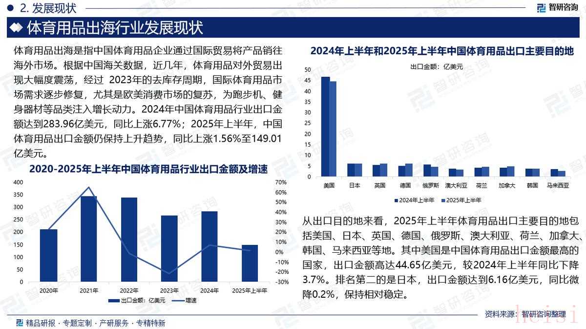 體育用品出海是指中國體育用品企業(yè)通過國際貿(mào)易將產(chǎn)品銷往海外市場。中國體育用品在全球市場上展現(xiàn)出強(qiáng)勁的出口勢(shì)頭,主要得益于其在品牌建設(shè)、供應(yīng)鏈效率以及性價(jià)比方面的綜合優(yōu)勢(shì)和競爭力。通過持續(xù)的品牌塑造和市場推廣,中國體育用品企業(yè)成功樹立了一系列具有國際影響力的品牌。同時(shí),中國在體育用品供應(yīng)鏈的建設(shè)和管理上表現(xiàn)出極高的效率,從原材料采購、生產(chǎn)制造到物流配送,整個(gè)流程的高效協(xié)同確保了產(chǎn)品的快速響應(yīng)和穩(wěn)定供應(yīng),大大提升了市場競爭力。此外,中國體育用品以其高性價(jià)比優(yōu)勢(shì)在國際市場上脫穎而出,合理的價(jià)格結(jié)合優(yōu)質(zhì)的產(chǎn)品性能,滿足了不同市場和消費(fèi)者群體的需求,進(jìn)一步擴(kuò)大了市場份額。根據(jù)中國海關(guān)數(shù)據(jù),近幾年,體育用品對(duì)外貿(mào)易出現(xiàn)大幅度震蕩,經(jīng)過2023年的去庫存周期,國際體育用品市場需求逐步修復(fù),尤其是歐美消費(fèi)市場的復(fù)蘇,為跑步機(jī)、健身器材等品類注入增長動(dòng)力。2024年中國體育用品行業(yè)出口金額達(dá)到283.96億美元,同比上漲6.77%;2025年上半年,中國體育用品出口金額仍保持上升趨勢(shì),同比上漲1.56%至149.01億美元。