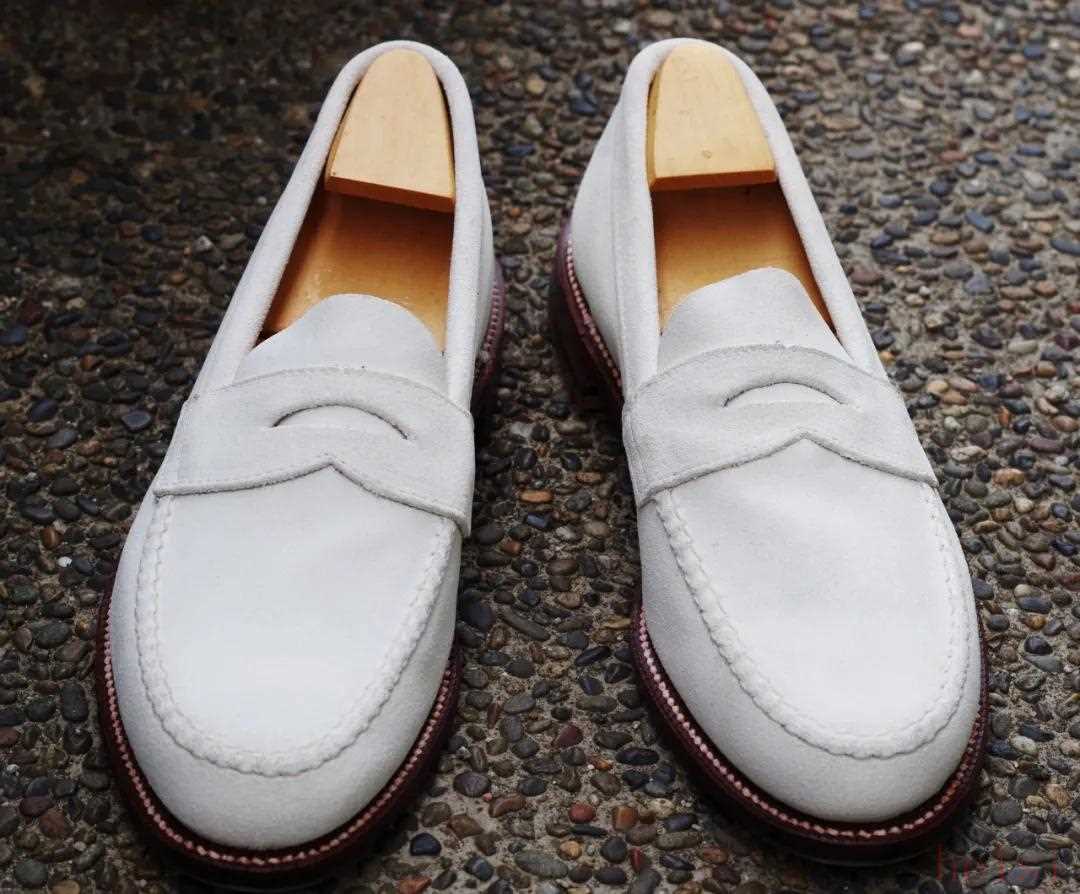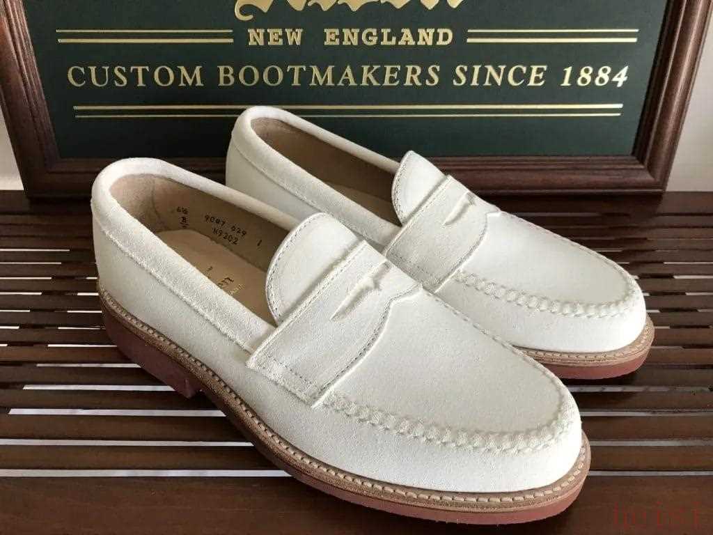 Alden 還有白色樂福鞋,盡管不是德比原型,但在品牌里面它們也被稱作 White Bucks,以 N9202 和 71430 為代表,都采用了莫卡辛手縫的鞋頭設(shè)計(jì),鞋底上前者為橡膠底,后者為軟木底。