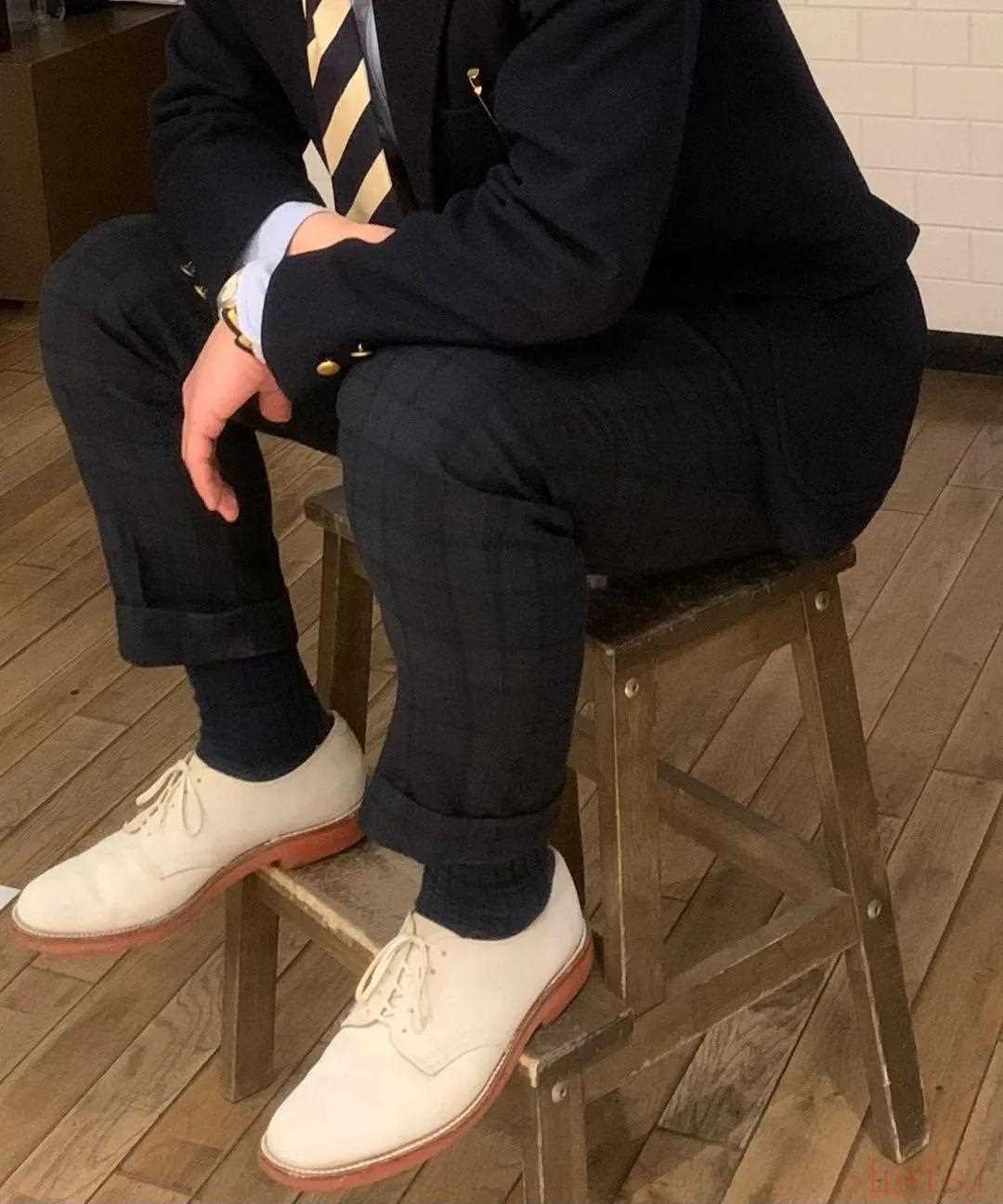 如果說白襪黑皮鞋還能看得過去,但要是把皮鞋換成白色,面積更大無疑就更突兀了。