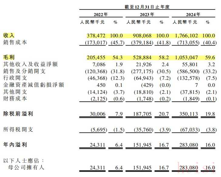 伯希和招股書顯示,2022年-2024年,伯希和營(yíng)收分別為3.79億元、9.08億元、17.66億元;經(jīng)調(diào)整凈利潤(rùn)分別為0.28億元、1.56億元和3.04億元,復(fù)合年增長(zhǎng)率為232%;毛利率分別為54.3%、58.2%和59.6%。