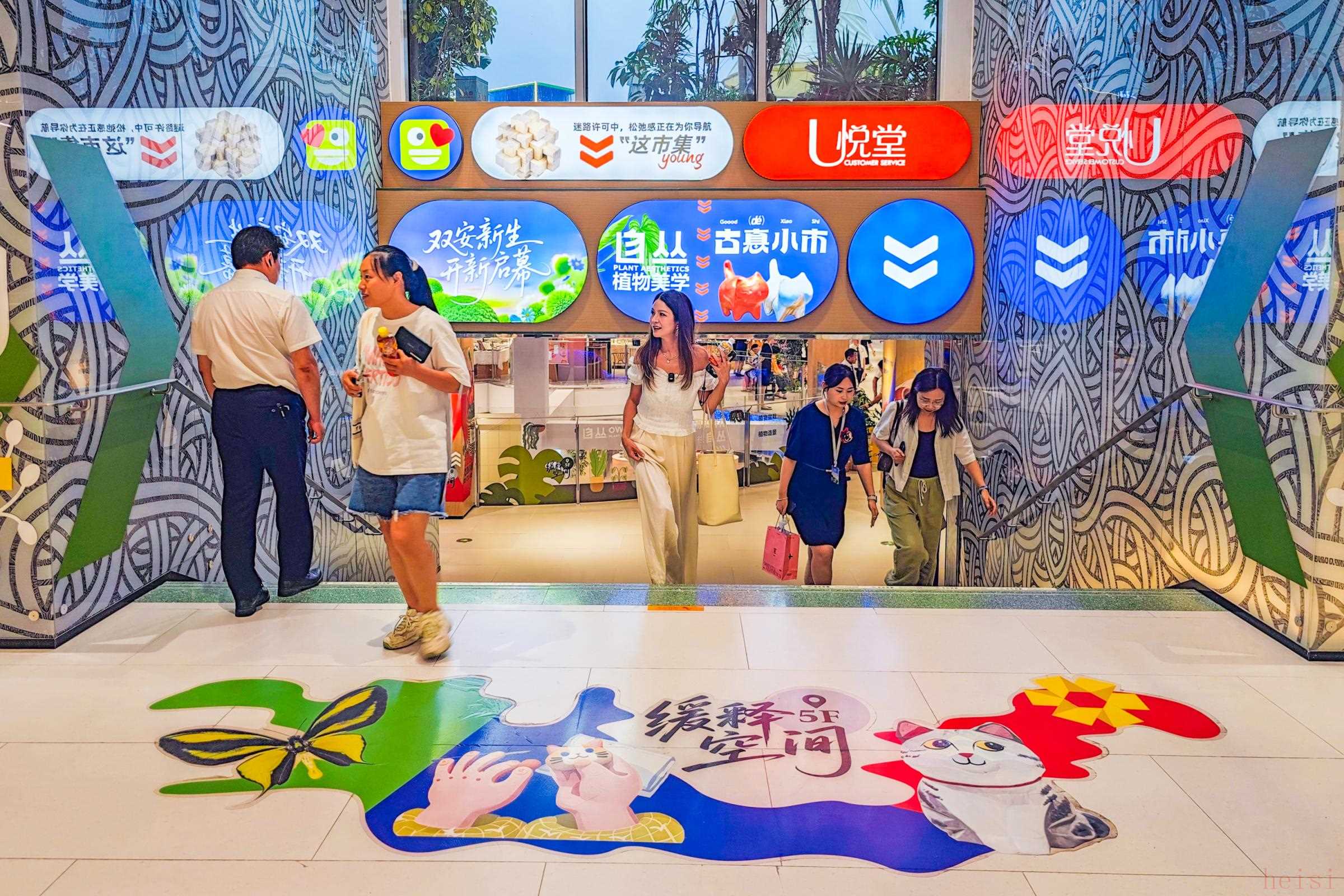 記者注意到,商場(chǎng)五層還新增直通頂層的階梯,拾級(jí)而上,新建的空中“仰望花園”映入眼簾,約1600平方米的花園空間內(nèi),顧客可以在綠植間放松休閑,還可以在露營(yíng)區(qū)小憩?;▓@內(nèi)設(shè)置了餐車、市集等區(qū)域,將經(jīng)常舉辦咖酒趴、藝術(shù)展、文娛活動(dòng),在鋼筋水泥的樓宇中增添了一抹清新。