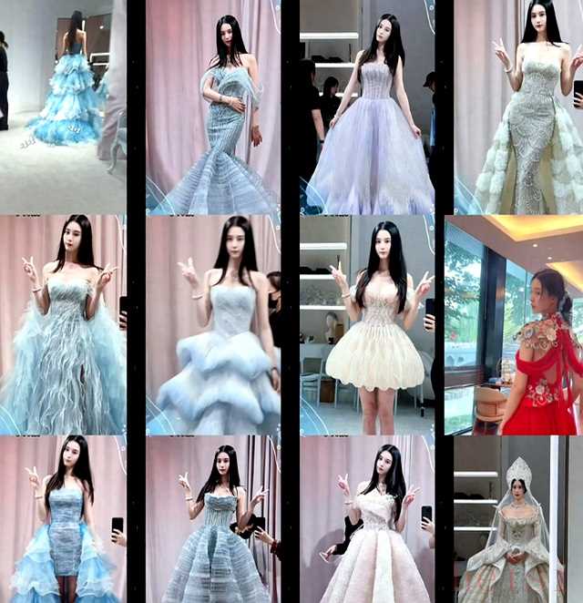 2. "被吐槽一股影樓風(fēng)":這通常意味著大眾認(rèn)為她試穿的這些婚紗(可能是西式婚紗,或者是某些比較俗氣、缺乏設(shè)計(jì)感的服裝)顯得有些: