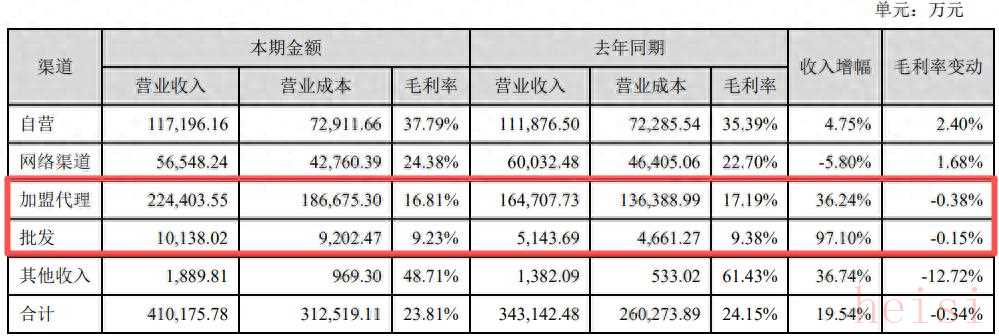 盡管潮宏基加盟渠道發(fā)展較快,但其毛利率明顯偏低。2025年上半年,潮宏基自營渠道的毛利率為37.79%,網絡渠道的毛利率也有24.38%,而加盟代理渠道的毛利率僅有16.81%,批發(fā)代理更是只有9.23%。所謂加盟代理模式,是指潮宏基旗下品牌對加盟或代理商進行授權,由加盟代理商在指定地點開設品牌專營店,相關人、財、物由加盟商支配,并按公司統(tǒng)一管理模式進行經營。而批發(fā)模式則是潮宏基將公司產品直接批量銷售給企業(yè)客戶的模式。