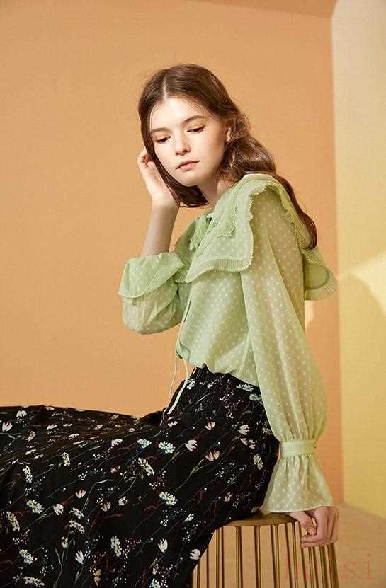 以本季最時髦的方形翻領(lǐng)復(fù)古小衫為例,這是一款整身使用圓形剪花雪紡面料的小衫,大熱的方形翻領(lǐng)邊緣處還加入了壓褶花邊,下半身搭配裙褲或是高腰裙,既又飄逸靈動的復(fù)古時髦感,又帶有小女生的浪漫感覺。專柜工作人員介紹,“我們一般會建議顧客選擇素雅的印花A版半裙來搭配這件綠色小衫,黑色的底色容易凸顯素雅的植物印花,在剪裁的過程中也加入了插片的設(shè)計,會讓這件裙子呈現(xiàn)傘裙的效果,走起路來也更加優(yōu)雅、知性,還帶點飄逸的浪漫視覺感?!?/p>