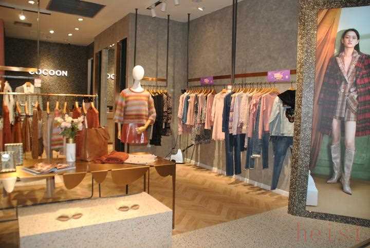 走進COCOON專柜,五彩斑斕的色調(diào)讓人眼前一亮。據(jù)悉,這一季的COCOON主打五彩色系毛衣,中庭陳列的帶有拋袖設(shè)計的彩虹紗線毛衣便是代表作之一。整件毛衣的觸感十分柔軟,寬松的弧形下擺,拉伸背部曲線,讓上半身看起來更加纖細(xì)瘦,搭配波薩諾瓦紅色小A裙,顯得俏皮又甜美。