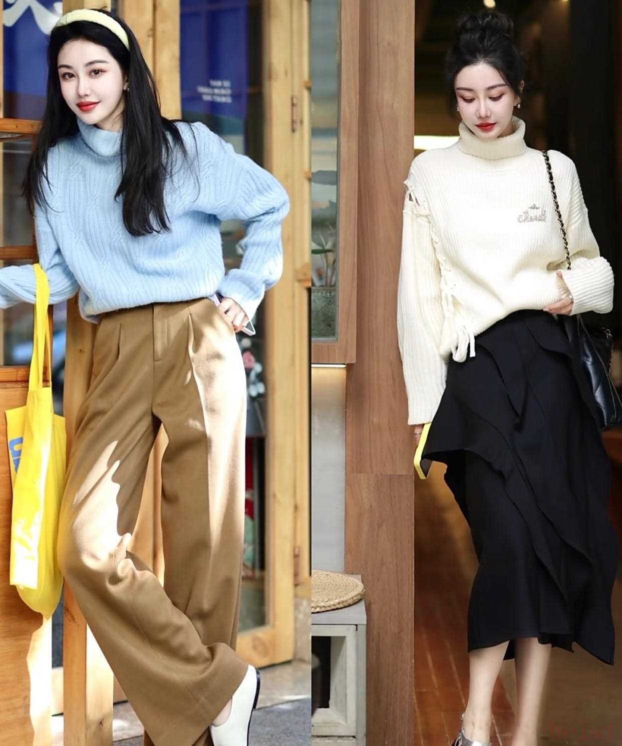 打頭陣的肯定是圓領(lǐng)毛衣。別覺得普通,一件輕薄合身、不過分寬大的圓領(lǐng)毛衣,什么日常、通勤統(tǒng)統(tǒng)都能壓住。厚款毛衣容易穿成“棉被俠”,中年身材小缺點(diǎn)反而一覽無遺。高領(lǐng)毛衣其實(shí)挺挑人,脖子夠長、整個人高挑,穿著很氣質(zhì);但只要肩脖稍短,一轉(zhuǎn)頭,妥妥的“縮脖土豆”。北方的姐妹御寒沒法省,只能從版型和色彩上去幫襯,比如淺色系高領(lǐng),顯得人精神又有溫度。