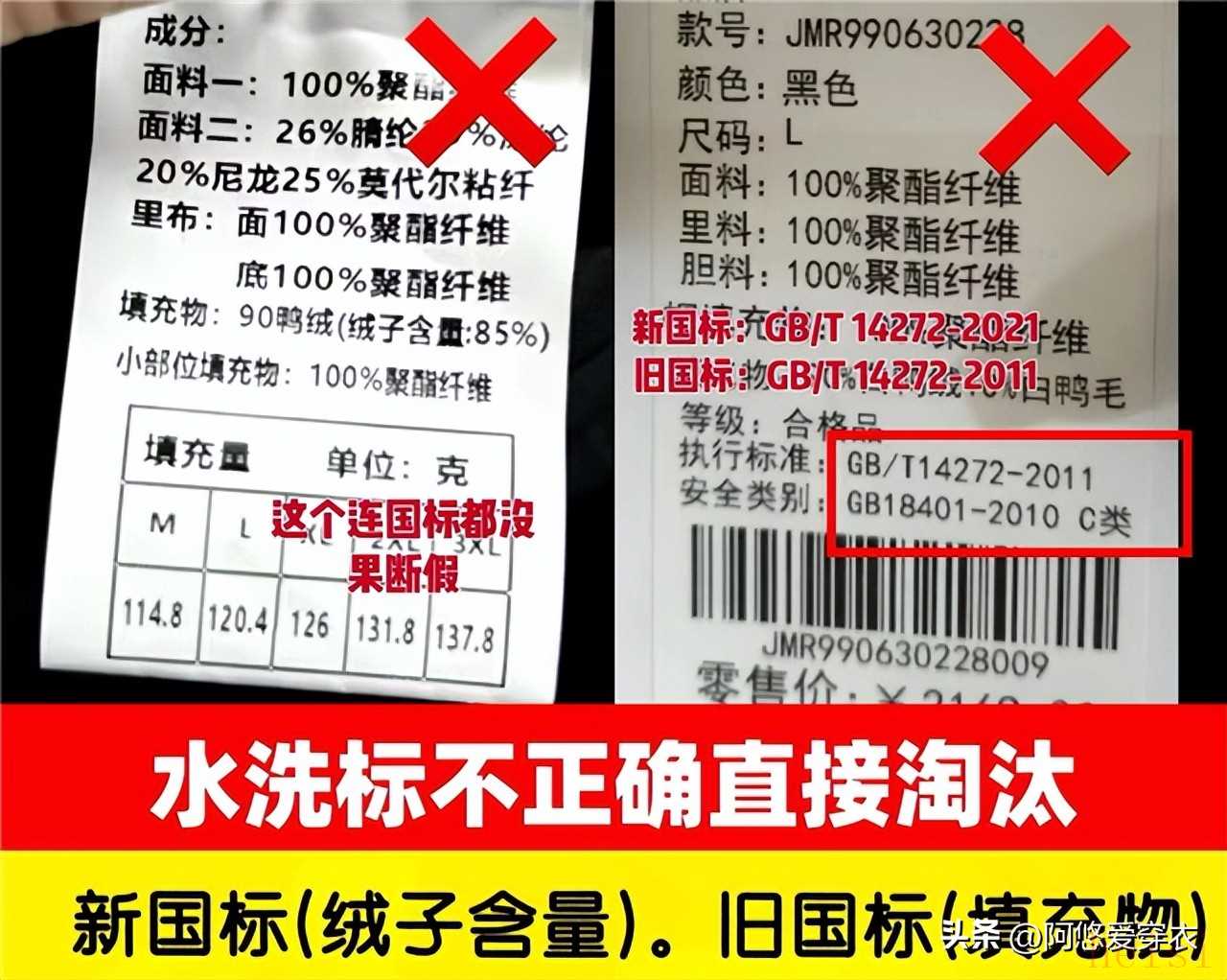買羽絨服,最關(guān)鍵的一個(gè)就是看吊牌上面的國標(biāo),必須認(rèn)準(zhǔn)標(biāo)注GB/T 14272-2021的新國標(biāo),要是看到了舊國標(biāo)信息或者完全不是國標(biāo)信息的羽絨服,那就淘汰吧,要么是假貨要么就是好幾年前的尾貨了,質(zhì)量肯定沒得保證。