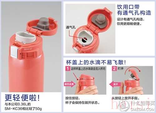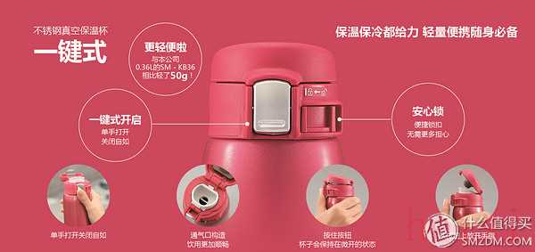 這也是一款非常經(jīng)典的杯型系列,大媽上口碑和擁有率都很高的一個(gè)系列,其中KT是與日亞合作版的代碼。SM-K系列屬于SLiT超輕巧系列不銹鋼保溫杯,瓶身體積小,便于攜帶,可單手飲水。采用304真空不銹鋼材質(zhì)內(nèi)膽,68攝氏度以上保溫6小時(shí),9攝氏度以下保冷6小時(shí),表現(xiàn)足夠出色。內(nèi)膽防沾涂層,可能部分朋友聞涂層色變,其實(shí)大可不必。同樣采用One-Touch一鍵開(kāi)合方便飲用,并且?guī)OCK鎖定按鈕,防止意外開(kāi)啟。這款的深可可色杯身啞光金屬面設(shè)計(jì)是小糖比較推崇的,握在手中絲毫沒(méi)有金屬冷冰冰的觸感。
