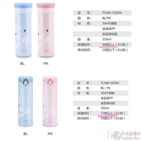 一鍵開(kāi)合是個(gè)方便指數(shù)UP的最重要方面,也是杯子保溫的重要法寶。(題外話)小糖在此也額外舉例分析一下,該圖為膳魔師2017推出的一款膚白貌美550ML的雪花系列保溫杯,根據(jù)官網(wǎng)提供的數(shù)據(jù)來(lái)看,在同樣材質(zhì)、容量的情況下,不同的開(kāi)口方式也會(huì)影響杯子在6小時(shí)的保溫能力,不信的話可看如下對(duì)比圖: