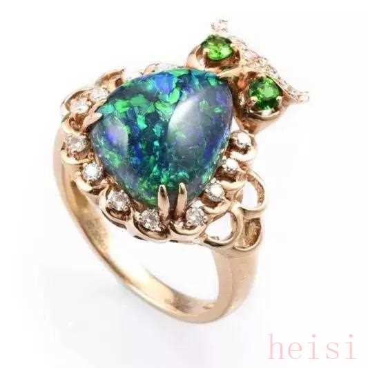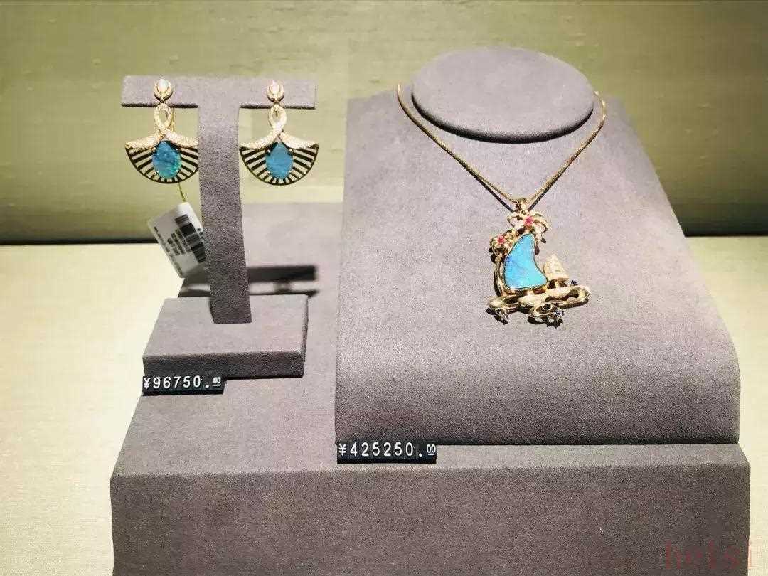 與此同時(shí),售價(jià)高達(dá)六位數(shù)甚至于七位數(shù)的紅藍(lán)寶石、祖母綠、歐泊等也在展臺(tái)上熠熠生輝。其中歐泊是來自澳大利亞的貴重寶石,它的色彩非常炫麗,你可以在一塊歐泊石上,看到紅寶石的火焰,紫水晶般的色斑,祖母綠般的綠色……而為了迎合中國消費(fèi)者的審美,這些歐泊飾品在設(shè)計(jì)中融入了扇形、龍等中國元素。