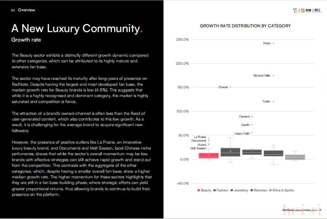 盡管擁有規(guī)模最大、發(fā)展最完善的粉絲基礎(chǔ),但在小紅書長期發(fā)展后,美妝行業(yè)或許已達(dá)成熟期,美妝品牌的增長率中位數(shù)較低(4.5%)。這表明,盡管美妝是一個高度認(rèn)可且占據(jù)主導(dǎo)地位的品類,但市場已高度飽和,競爭十分激烈。