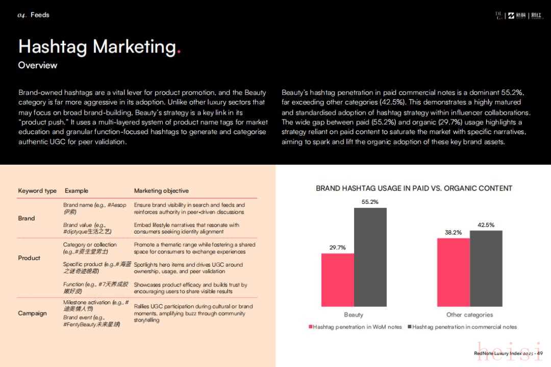 品牌自有話題標(biāo)簽是產(chǎn)品推廣的關(guān)鍵手段,而美妝品類在運用這類標(biāo)簽上要積極得多。與其他可能聚焦品牌建設(shè)的奢侈品領(lǐng)域不同,美妝行業(yè)的策略是其 “產(chǎn)品推廣” 鏈路中的核心環(huán)節(jié):它借助細(xì)致的多層級產(chǎn)品名稱標(biāo)簽體系開展市場教育,并利用聚焦功能的話題標(biāo)簽,生成并歸類真實的用戶生成內(nèi)容(UGC),以獲取同儕的認(rèn)可。