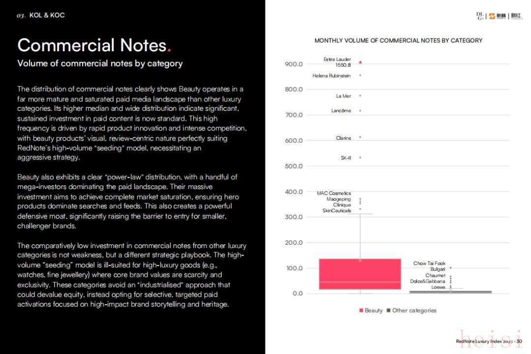商業(yè)筆記的分布清晰表明,美妝行業(yè)所處的付費媒體生態(tài),遠(yuǎn)比其他奢侈品品類更成熟、更飽和。其付費內(nèi)容相關(guān)數(shù)據(jù)的中位數(shù)更高且分布更廣泛,這意味著對付費內(nèi)容進(jìn)行大規(guī)模且持續(xù)的投入,如今已成為行業(yè)常態(tài)。這種高頻態(tài)勢由快速的產(chǎn)品創(chuàng)新和激烈的競爭驅(qū)動,而美妝品牌視覺化、以測評為核心的屬性,與小紅書的大規(guī)模 “種草” 模式完美適配,這使得品牌必須采取積極進(jìn)取的策略。