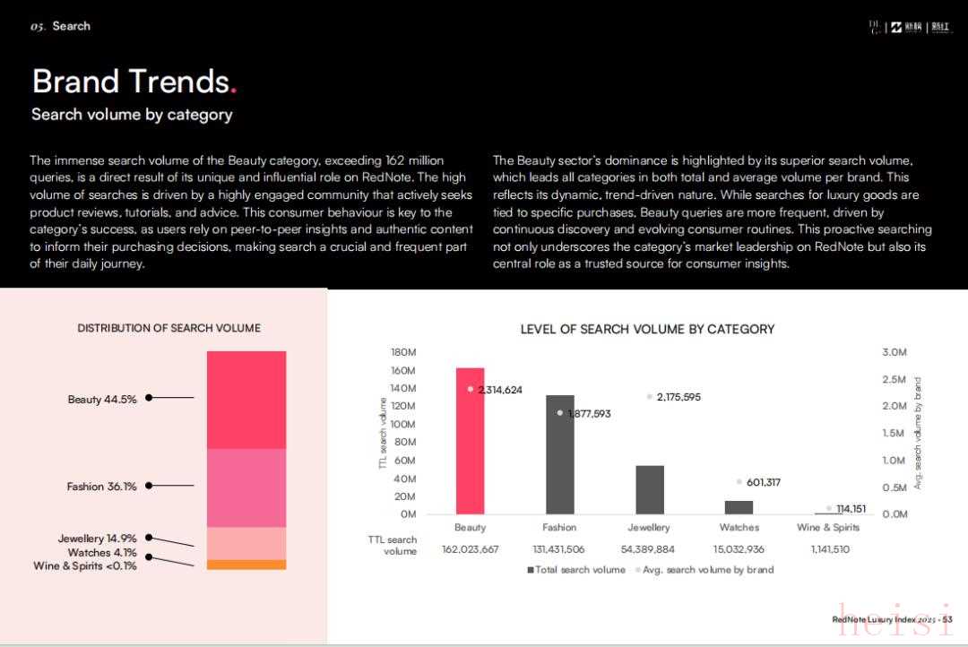 美妝品類憑借其顯著的搜索量優(yōu)勢,在平臺占據(jù)主導(dǎo)地位,其搜索總量和品牌平均搜索量均領(lǐng)跑全品類。這反映出其充滿活力、趨勢驅(qū)動的特性。奢侈品搜索往往與具體購買行為相關(guān),而美妝類查詢則更為頻繁,源于持續(xù)的探索需求和不斷演變的消費習(xí)慣。這種前瞻性搜索不僅彰顯該品類在小紅書平臺的市場領(lǐng)導(dǎo)地位,更凸顯其作為消費者洞察可信來源的核心價值。
