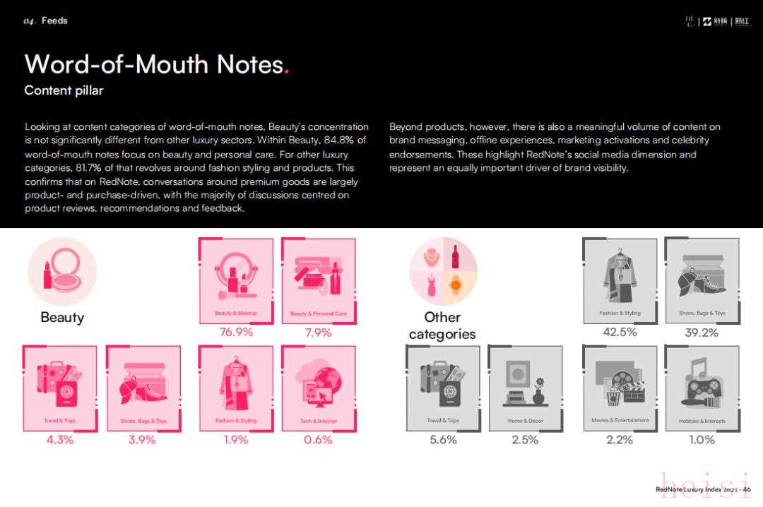 從種草筆記的內(nèi)容類別來看,美妝行業(yè)的內(nèi)容集中度與其他奢侈品領(lǐng)域并無顯著差異。在美妝領(lǐng)域內(nèi),84.8%的種草筆記聚焦于美妝個護(hù)。對于其他奢侈品品類,小紅書上圍繞高端商品的討論中,有81.7%在很大程度上被歸類為圍繞造型和產(chǎn)品展開。這證實,美妝領(lǐng)域的討論以產(chǎn)品和購買為導(dǎo)向,大部分討論集中在產(chǎn)品評測、推薦與反饋上。