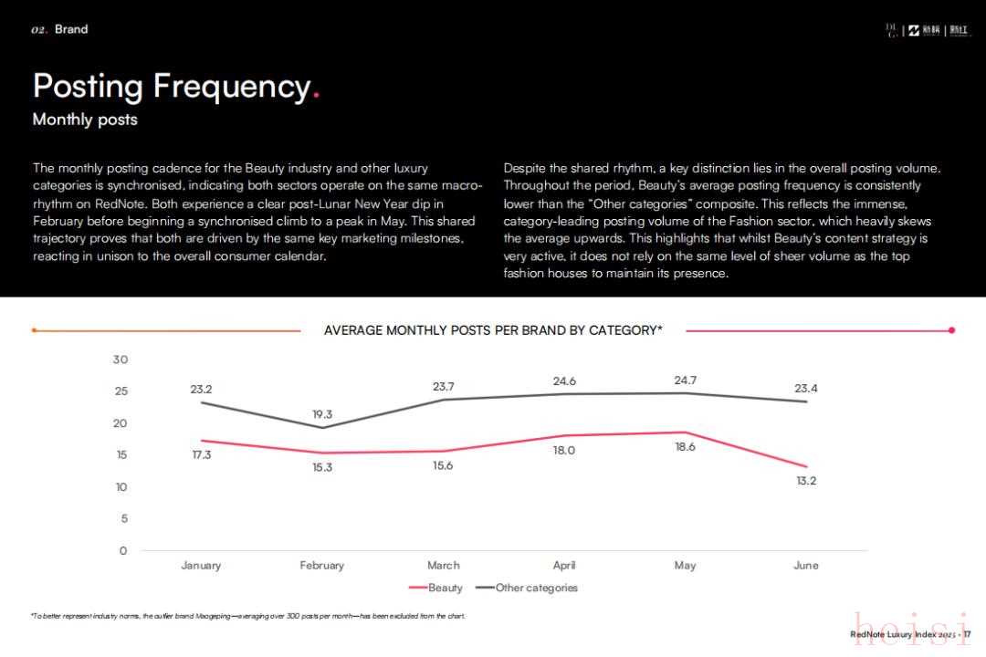 美妝行業(yè)與其他奢侈品品類的月度發(fā)帖節(jié)奏是同步的,這表明兩個領(lǐng)域在小紅書上遵循著相同的宏觀節(jié)奏。兩者在農(nóng)歷新年后的2月都會經(jīng)歷一段沉寂期,隨后開始同步攀升,直至5月達(dá)到峰值。這種共同的軌跡證明,兩者都受到相同關(guān)鍵營銷節(jié)點的驅(qū)動,會一致地對整體消費者日歷的節(jié)奏做出反應(yīng)。