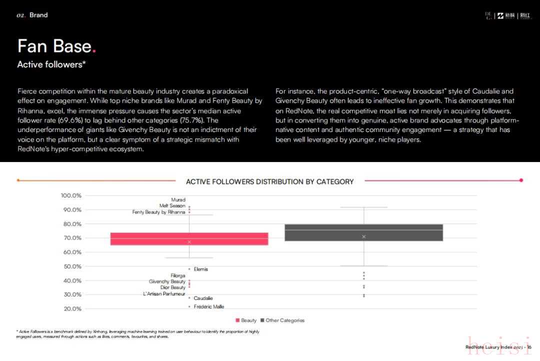 成熟美妝行業(yè)內(nèi)的激烈競爭,對(用戶)互動產(chǎn)生了一種矛盾的影響:盡管Murad和Fenty Beauty等頭部小眾品牌表現(xiàn)出色,但巨大的壓力仍導(dǎo)致該行業(yè)的活躍粉絲率中位數(shù)(69.6%)低于其他品類(75.7%)。紀(jì)梵希美妝(Givenchy Beauty)等行業(yè)巨頭的表現(xiàn)不佳,并非是對其在該平臺上發(fā)聲能力的否定,而是其戰(zhàn)略與小紅書平臺高度競爭的生態(tài)系統(tǒng)存在錯位的明確體現(xiàn)。