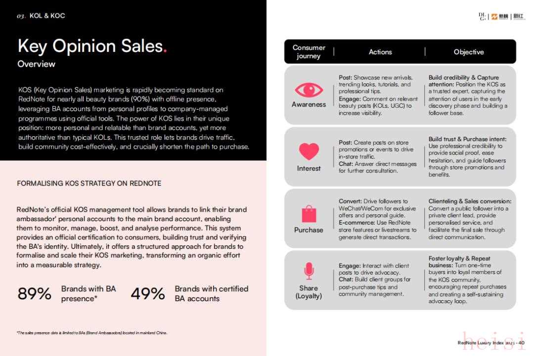KOS(關(guān)鍵意見銷售)營銷正迅速成為小紅書平臺上幾乎所有擁有線下渠道的美妝品牌(90%)的標(biāo)準(zhǔn)模式。該策略通過官方工具將美容顧問個人賬號轉(zhuǎn)化為企業(yè)管理項目。其核心優(yōu)勢在于獨特定位:較品牌賬號更具親和力,較傳統(tǒng)KOL更具權(quán)威性。這種可信角色使品牌能高效引流、低成本建群,并顯著縮短購買決策路徑。