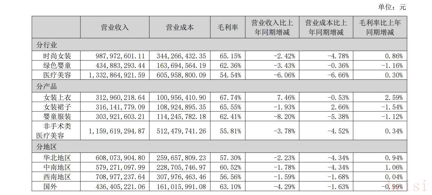 具體到各業(yè)務(wù)板塊,今年上半年,朗姿股份三大業(yè)務(wù)均出現(xiàn)負(fù)增長(zhǎng)。其中,醫(yī)療美容業(yè)務(wù)實(shí)現(xiàn)營(yíng)業(yè)收入13.33億元,與上年同期的14.19億元相比下滑6.06%,占公司營(yíng)業(yè)收入的比重也由上年同期的48.7%降至47.8%。此外,新京報(bào)貝殼財(cái)經(jīng)記者注意到,該公司醫(yī)療美容業(yè)務(wù)的毛利率為54.54%,低于時(shí)尚女裝的65.15%、綠色嬰童的62.36%。
