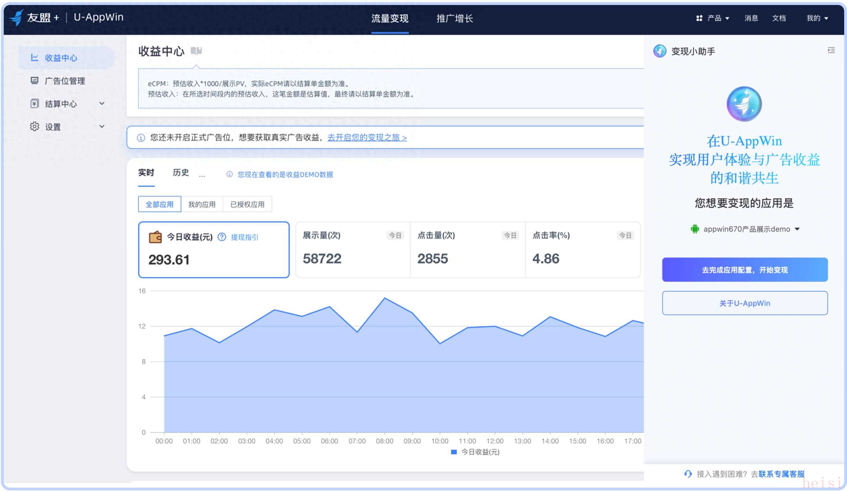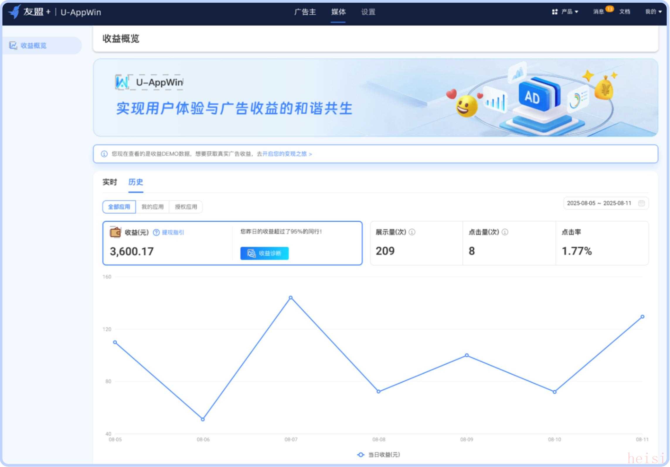 第三步:持續(xù)分析并優(yōu)化收益表現(xiàn)。U-AppWin支持首頁實時展示,涵蓋當日收益、展示效果等關鍵指標,同時,系統(tǒng)還支持多維收益分析及行業(yè)對標功能,幫助判斷媒體主收益健康度,從而持續(xù)調整策略、挖掘每一份流量的潛在價值。