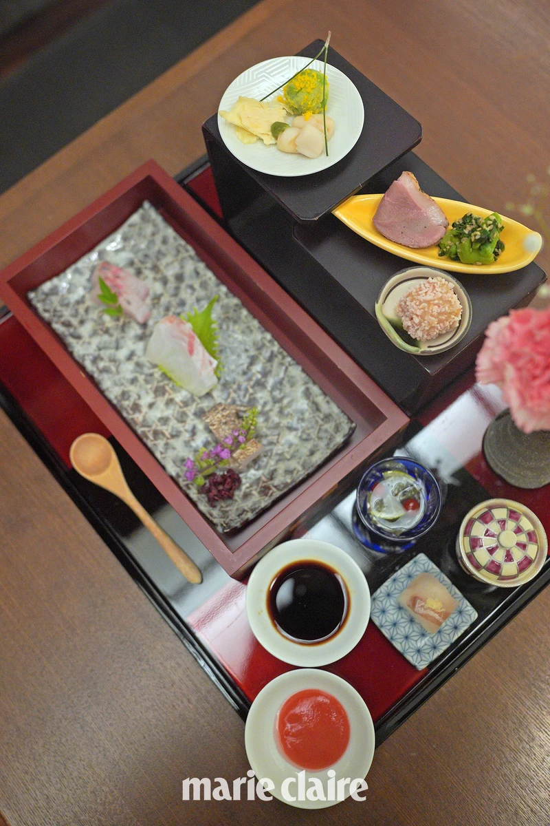 迎賓八寸則使用寄木細(xì)工的盒子裝載,賞心悅目且別具意義,內(nèi)容有以山椒、味噌調(diào)味的豆皮蛤蠣肉,以及油菜花佐芝麻醬、海鯛押壽司、鴨腰肉切片、酢橘番茄佐莼菜、酥炸胡麻豆腐、蝦肉握壽司,一旁則有白魽、紅鯛、魛魚(yú)的生魚(yú)片切盤(pán)。