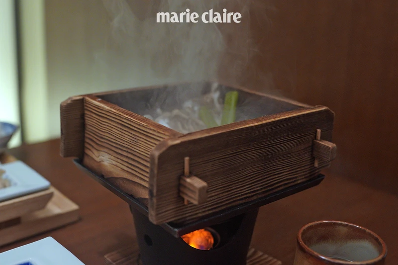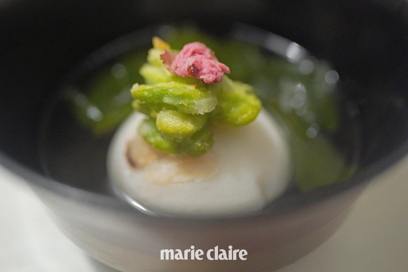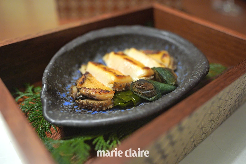 湯品則使用鱈魚(yú)漿包裹著蛤肉的餃子,放上油炸蠶豆,淋上以海藻、日式高湯熬煮的醬汁,最后點(diǎn)最上漬櫻花,每口可品嘗到高雅的香氣;蒸物則為,烤物則是,以奶油稍微煎製后,再煙燻加入香氣,最后以神奈川縣境內(nèi)湘南名物金橙鹽做以調(diào)味,飽口軟嫩的肉質(zhì),每口咀嚼都伴隨著煙燻香氣與魚(yú)鮮滋味。