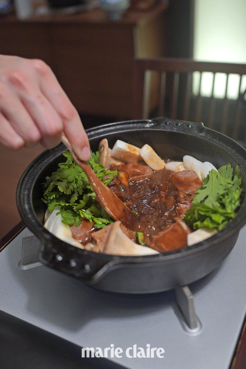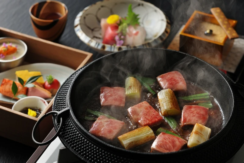 主菜特別端上了日本著名料理之一,此為明治時(shí)代就深受歐美人士影響的西式料理,選用肉質(zhì)軟嫩的黑毛和牛,加入以味噌、醬油與砂糖調(diào)製的醬料一起烹煮,待牛肉約六七分熟后再放進(jìn)當(dāng)?shù)厥a(chǎn)的時(shí)蔬,最后搭配上以特製的土鍋悶煮香Q白飯、溫泉蛋一起食用,而界 箱根同仁將在桌邊服務(wù),完美呈現(xiàn)此名物的美味。