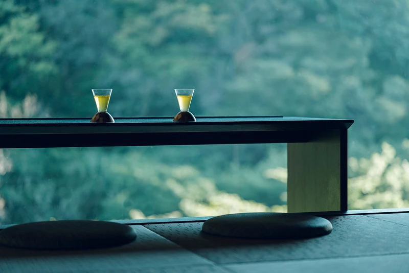 喜歡小酌的賓客則能在客房享用,依造喜好選擇三款清酒,酒款皆完美銜接了當(dāng)代清酒風(fēng)格,一改過(guò)去的印象,并搭配上用酒糟腌漬芥末葉、莖和根製成的,以及等下酒菜,在萬(wàn)籟俱寂的箱根之夜,搭配著山間潺潺溪流水聲和蟲(chóng)鳴背景音樂(lè),坐在眺望山河景緻的吧臺(tái)座位細(xì)細(xì)品味,深刻感受到古樸與浪漫共存的魅力。