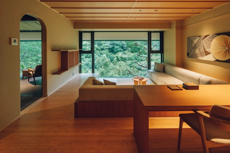 客房部分全面翻新,皆以為靈感,并為題。房?jī)?nèi)以柔和木質(zhì)與自然色調(diào)為主軸,加入斗笠、草鞋、燈籠等象徵旅途記憶的裝飾元素,并融入箱根代表性的寄木細(xì)工細(xì)節(jié)。新設(shè)的窗框設(shè)計(jì)可全面開(kāi)啟,讓溪畔空氣與陽(yáng)光自然流入室內(nèi),呈現(xiàn)出比過(guò)往更貼近自然的住宿體驗(yàn)。此外,也新增兩間限定豪華套房 ,擁有寬敞客廳、專(zhuān)屬露天浴池與景觀窗景,為旅宿增添更靜謐的層次感。