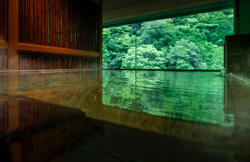 另一個(gè)迷人的場(chǎng)景則是男湯露天大浴場(chǎng),半露天的溫泉浴池使用古老檜木打造,從入口望去有傳統(tǒng)日式建筑切妻屋根的外觀,比鄰的則是潺潺溪流,旅人可在此享受流水聲相伴的閑適靜謐,伴隨著感受四季流轉(zhuǎn)的山景、河景以及絢爛多彩的樹(shù)影搖曳,在檜木香氣縈繞的空間中,以水氣氤氳洗去一身疲憊,身心都會(huì)得到凈化。