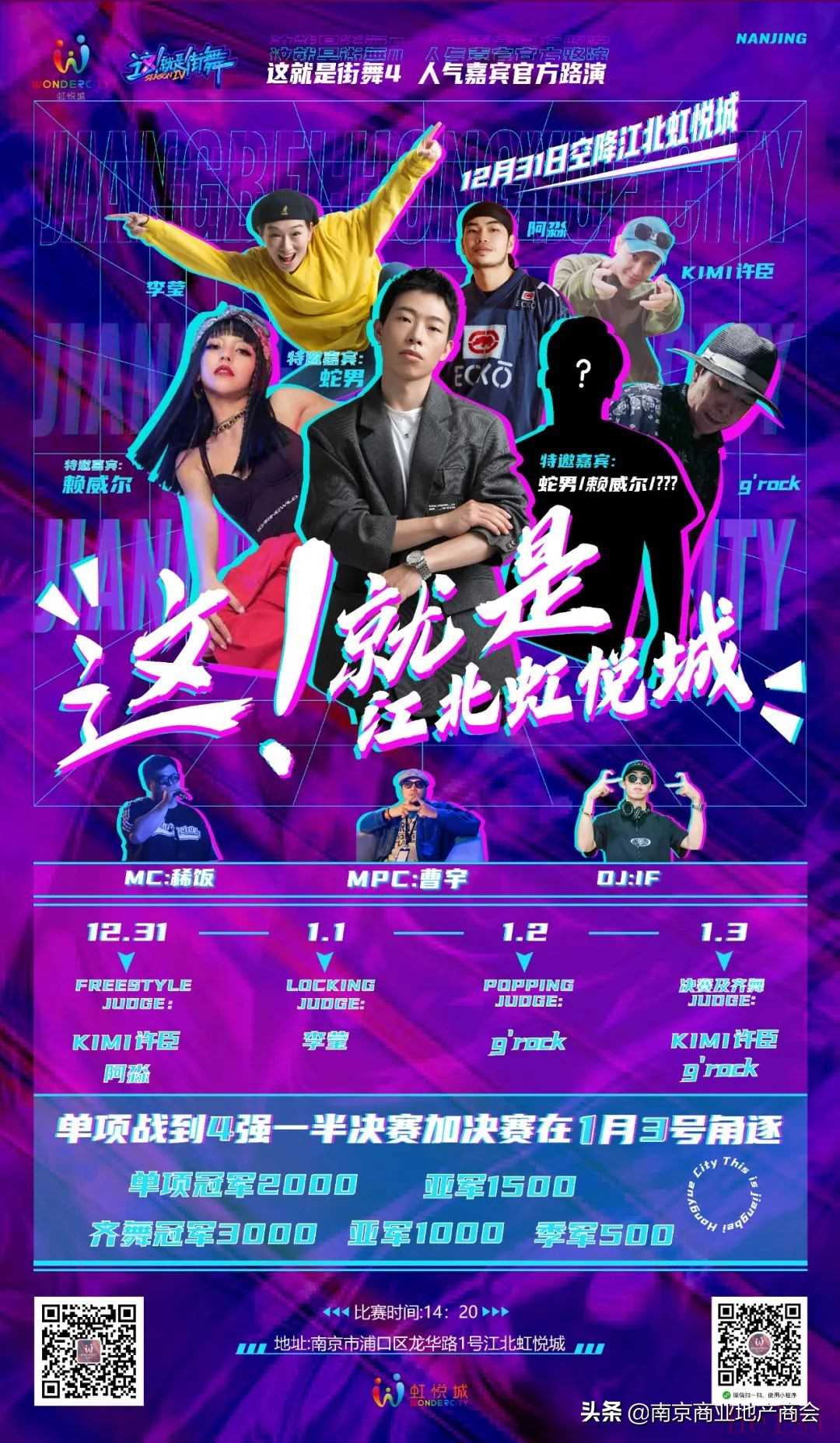 開業(yè)期間,江北虹悅城引入“這街”(這就是街舞)IP,在12月31日,全天不間斷的上演精彩潮流活動。下午2點(diǎn),這就是南京街舞比賽率先登場,全能舞者賴威爾也帶來了個人街舞solo秀。